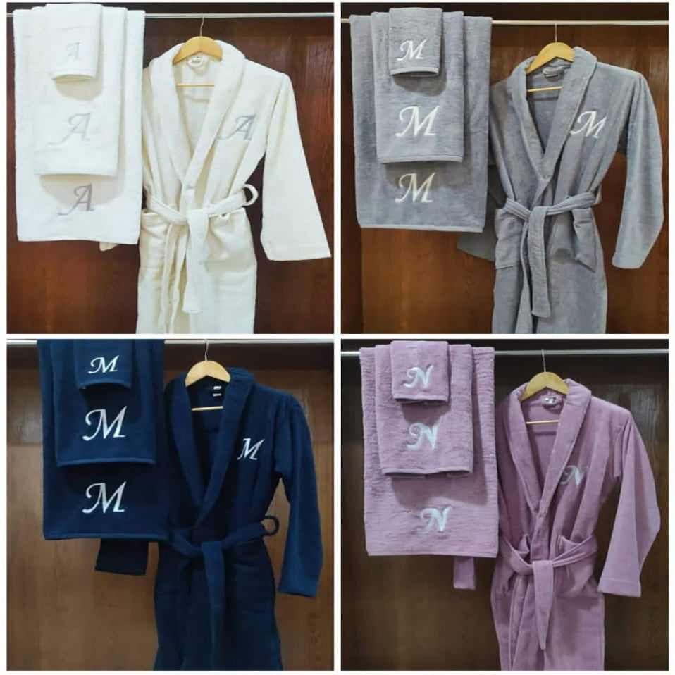 الوصف: برنس الحمام المطرز الفاخر مع 3فوط مطرزة بالأحرف الأولي من جاكاردينا