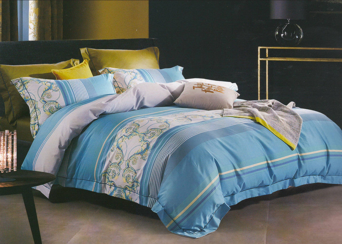 طقم لحاف مصنوع من القطن فتلة 60 متخيط كابوتنيه جاهز للاستخدام و محشي ميكروفايبر ، الطقم مكون من 6 قطع (لحاف+ملاية+ 4 كيس خددية) ، تركيز النسيج : 500 عقدة ، الخامة : قطن ناعم